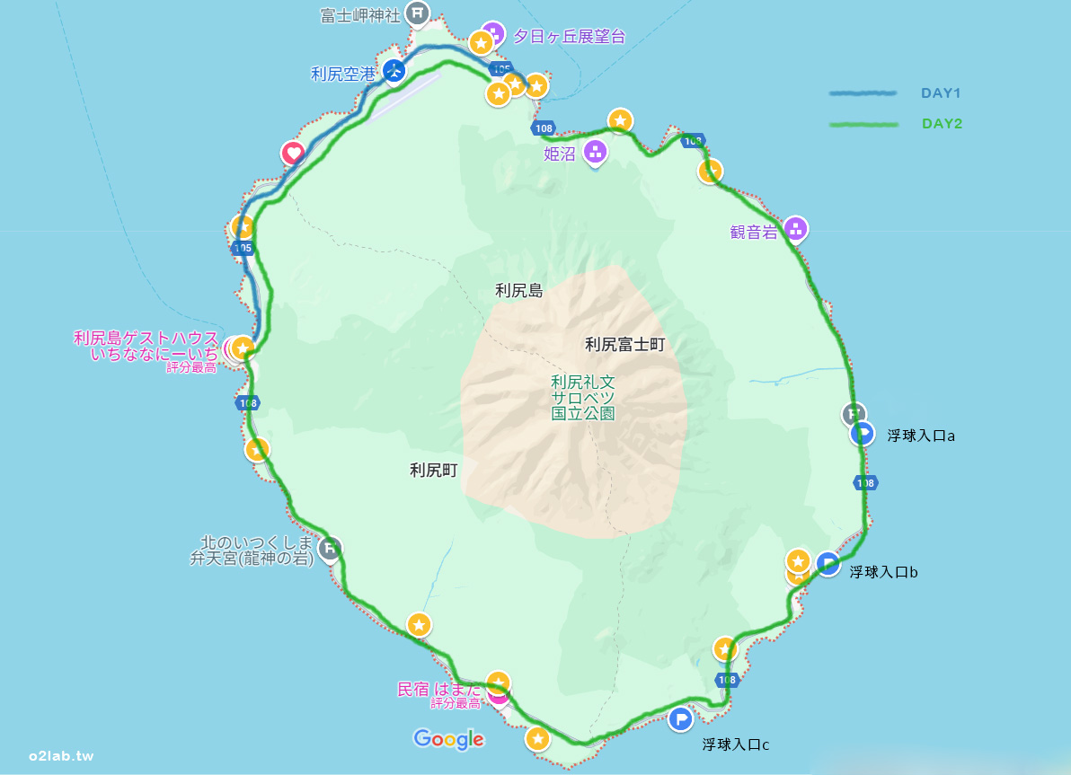 在google map上定了三個地標,是比較能夠接近海岸線沿著海岸走一段的入口。利尻島雖然四面環海是個小島,但從一般的柏油馬路要接近到真的走在海岸邊,不是非常容易,也怕誤闖私人領域。當然風景區例外啦,但你應該也知道,身為風景區,可能也不會讓你看到海漂物,更別說是玻璃浮球了。所以尋覓的海岸線,通常都是比較沒有遊客會接近的地方。玻璃浮球前情提要結束,要來展開利尻島的第二天囉…