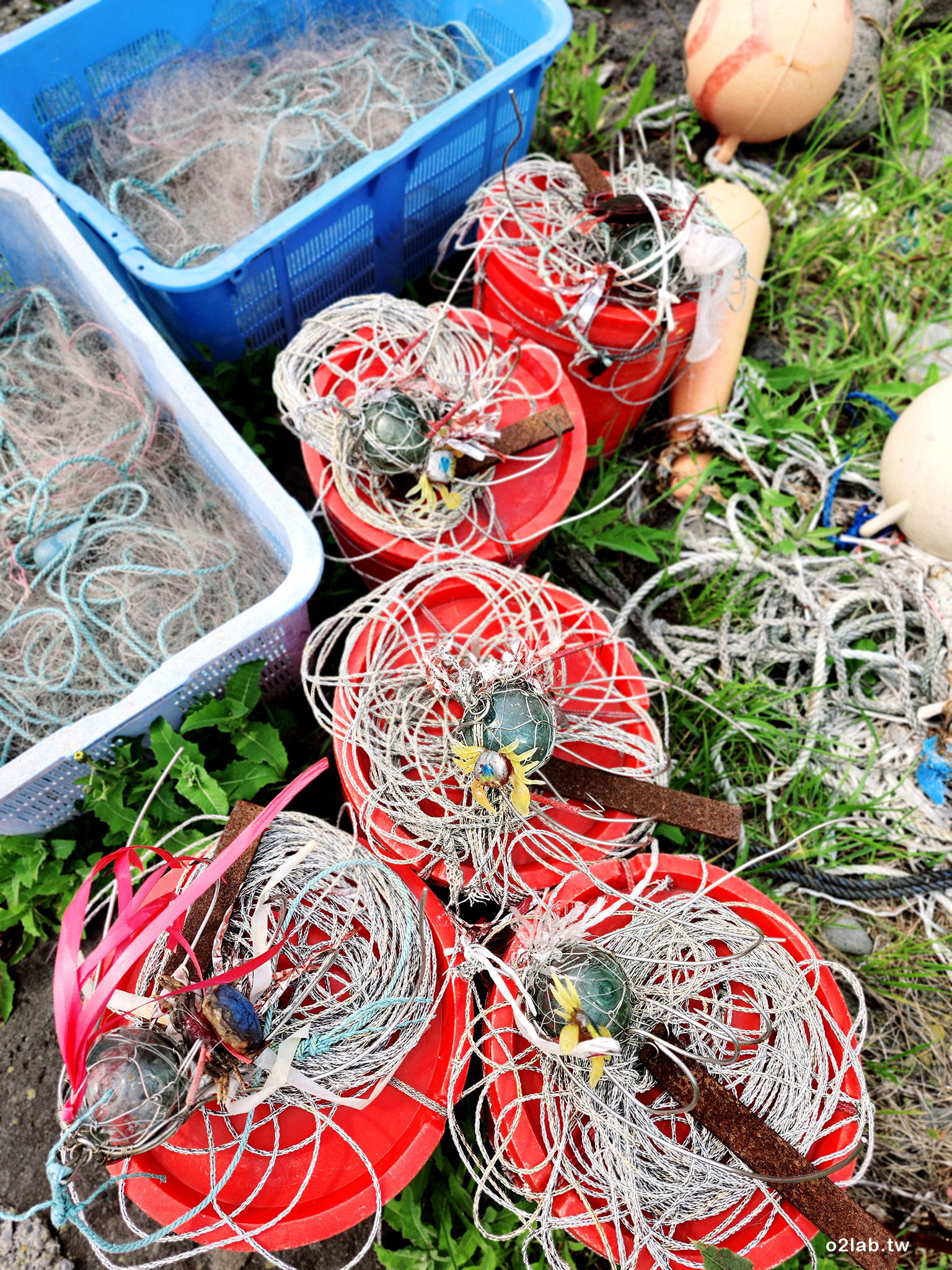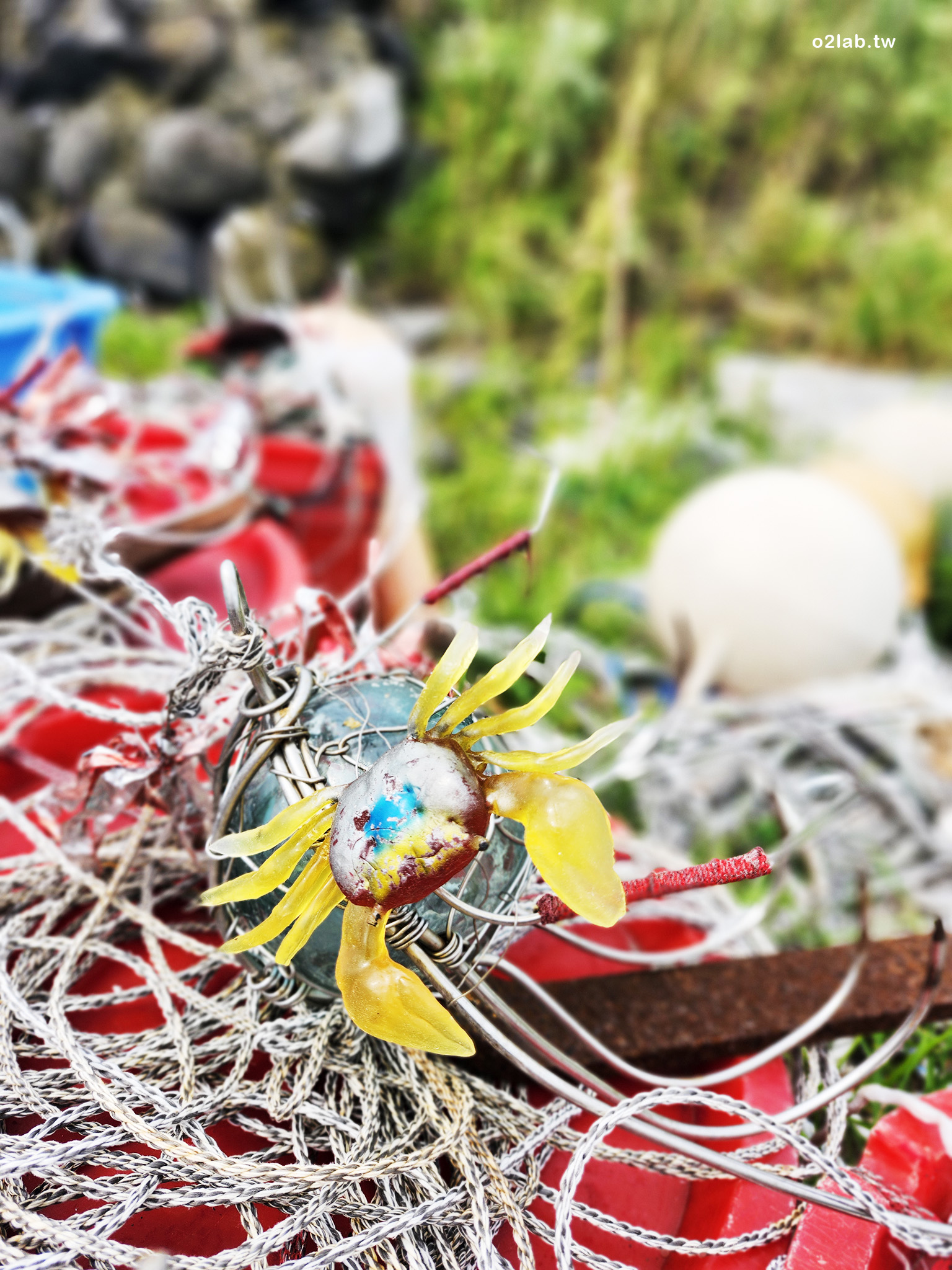 今天在一個小小漁村,瞄到閃閃發亮的誘餌,不曾看過便靠近研究了一下。看起來像放緄,但勾子超大,是不是就是所謂的大緄?但奇怪的是,勾子和浮球是緊緊綁在一起,這樣又不像放緄,好疑惑…勾子上還會纏閃亮亮的彩帶和擬真的螃蟹,不知是抓啥的?(答案請見後文)