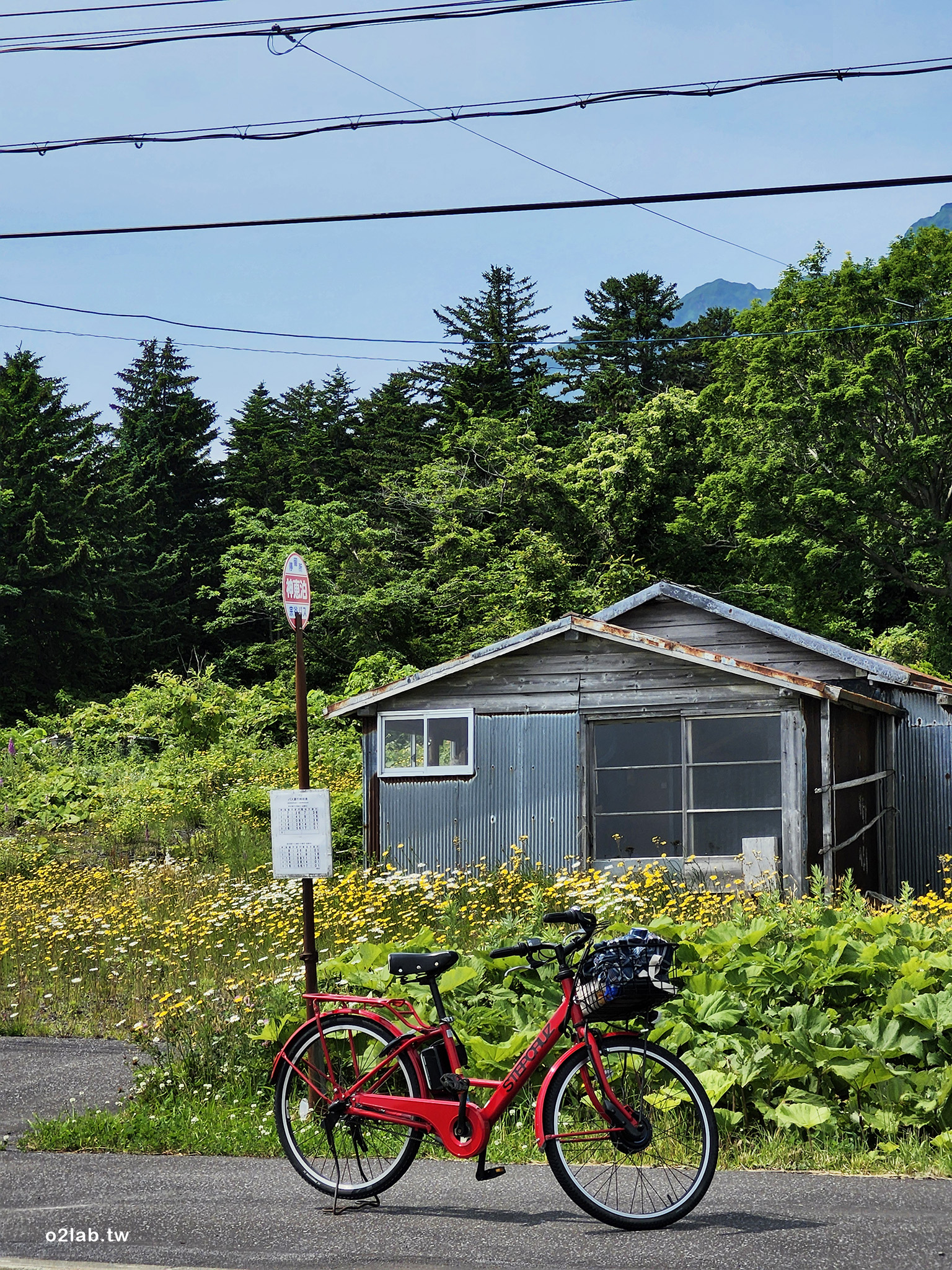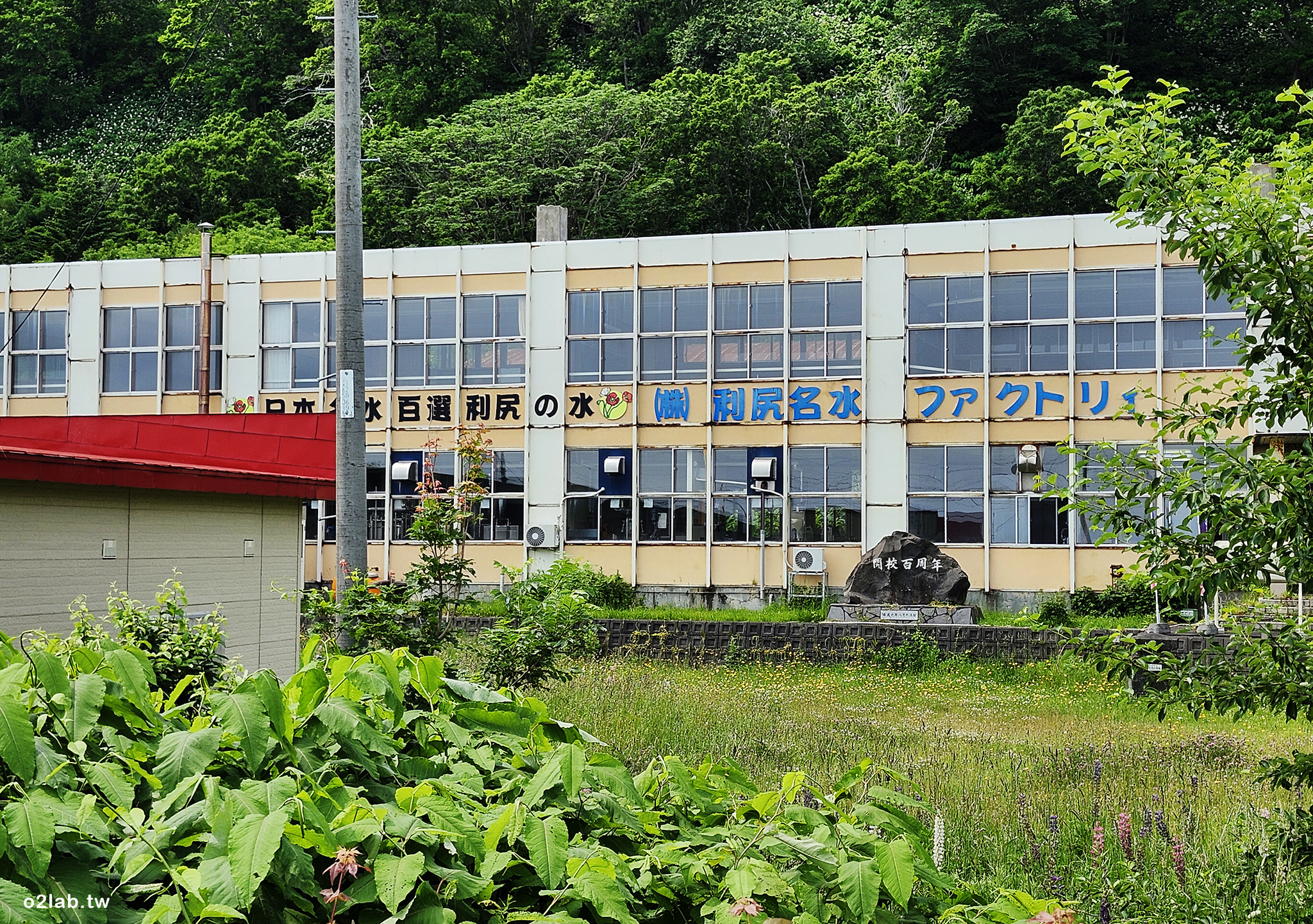 滑到平地,熟悉的景色一幢廢棄學校改成的利尻名水工廠。