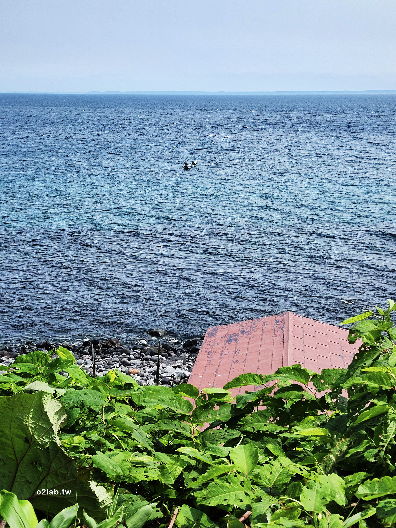 似乎快要靠近自己設定的第一浮球入口,不過從馬路到海岸真的有厚厚的植物們,想要直接穿過難度相當的高。海面上小小的船隻感覺應該在進行漁業活動,但實在太遠,看不出是在做什麼捕撈?