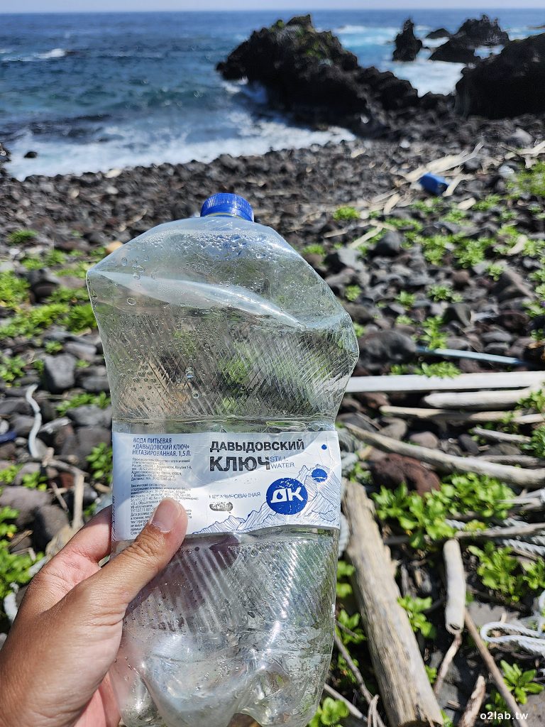 來自俄羅斯的寶特瓶。以前到了鄂霍次克海峽都會特別去海邊看看有沒有俄羅斯飄過來的海廢,但都沒撿到過。這趟終於在這個北邊小島遇見了(放進包包)