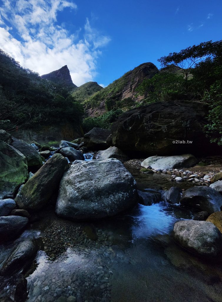下到半屏溪,如果溯溪往前應該就能抵達大鬼瀑布。那好尖好尖高聳入天的是保羅尖。周邊有超多路線可以爬 : 保羅尖啦、小錐麓等等…,可以安排再來把週邊的路線都走一走咧